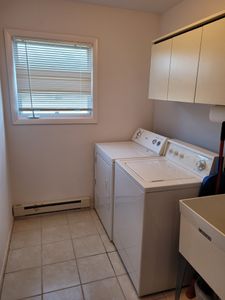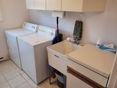 The home has a fully-equipped modern kitchen with all appliances including a dishwasher. There is a standard drip coffee maker and basic coffee and filters are included with the rental. There is also a good supply of pots, pans, and cooking and dining utensils provided in the kitchen. The home also has a laundry room with a full-size washer and dryer as well as a laundry sink and cabinets.