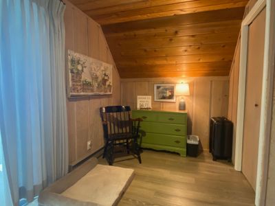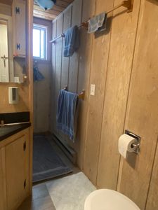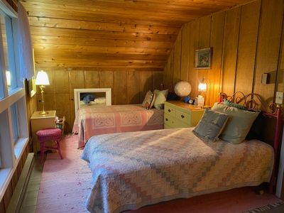 Inside, there are also great lake views from the living room, dining room, and one of the bedrooms. The home has 4 bedrooms and 2 bathrooms. There are 2 bedrooms and 1 bathroom on each floor, with the second floor bedrooms and bathroom being basically mirror images of the first floor bedrooms and bathroom. The cottage also features a full kitchen with a dishwasher, a wood fireplace in the living room (firewood not provided), high-speed Wi-Fi, satellite and streaming television, board games, puzzles, a front load washer and dryer, and air conditioning.