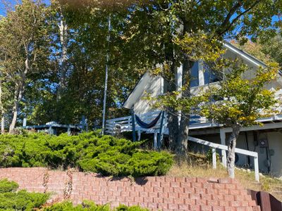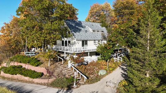 Sunset Serenity is an incredible home! It's located on a private bluff overlooking Lake Michigan and there are truly spectacular views of Lake Michigan for miles from the home. The home features a wrap-around deck and second detached deck with great lake views from all points. There are also posts and a hammock available for relaxing in a hammock while watching the waves of Lake Michigan from the bluff.