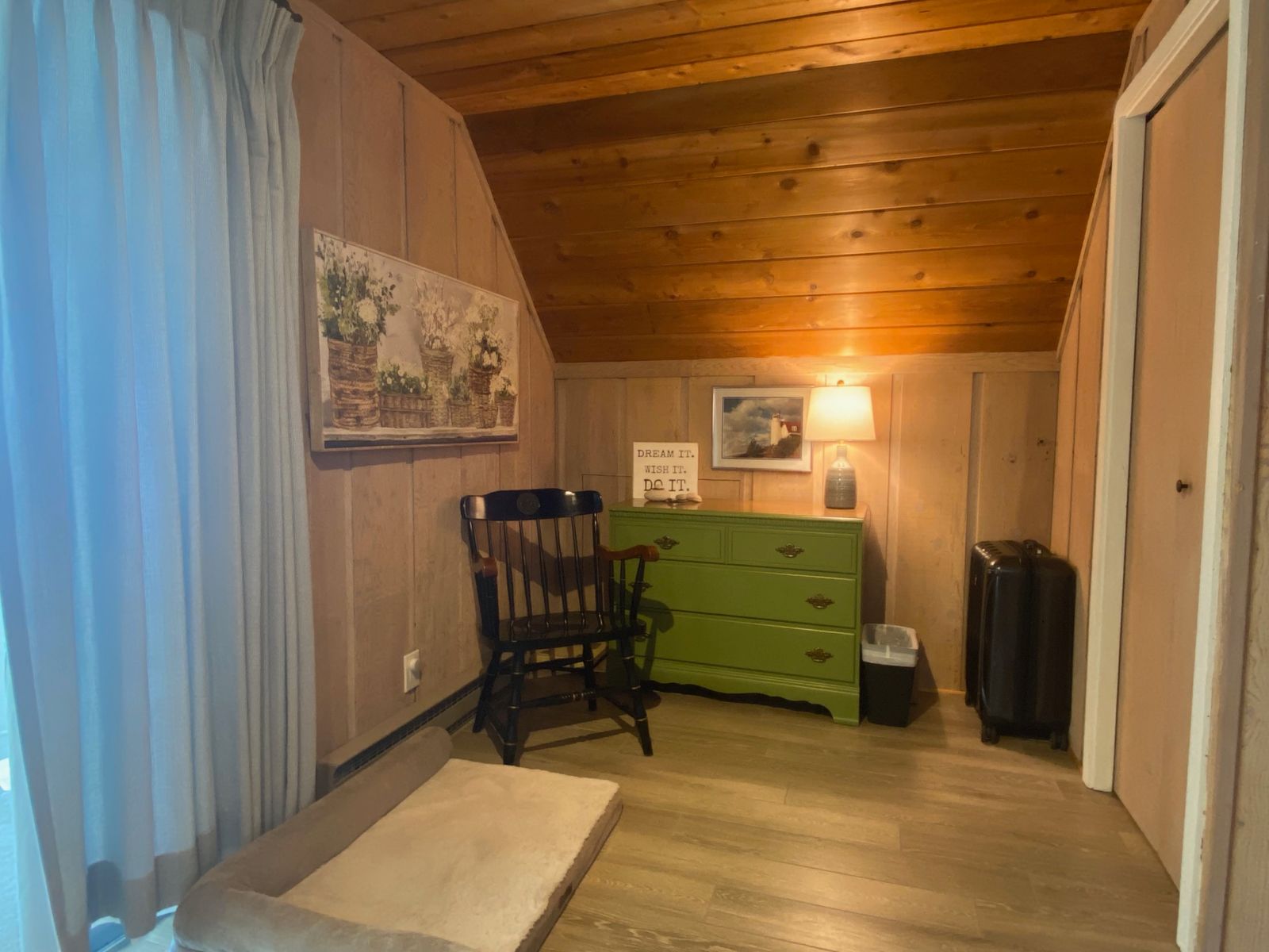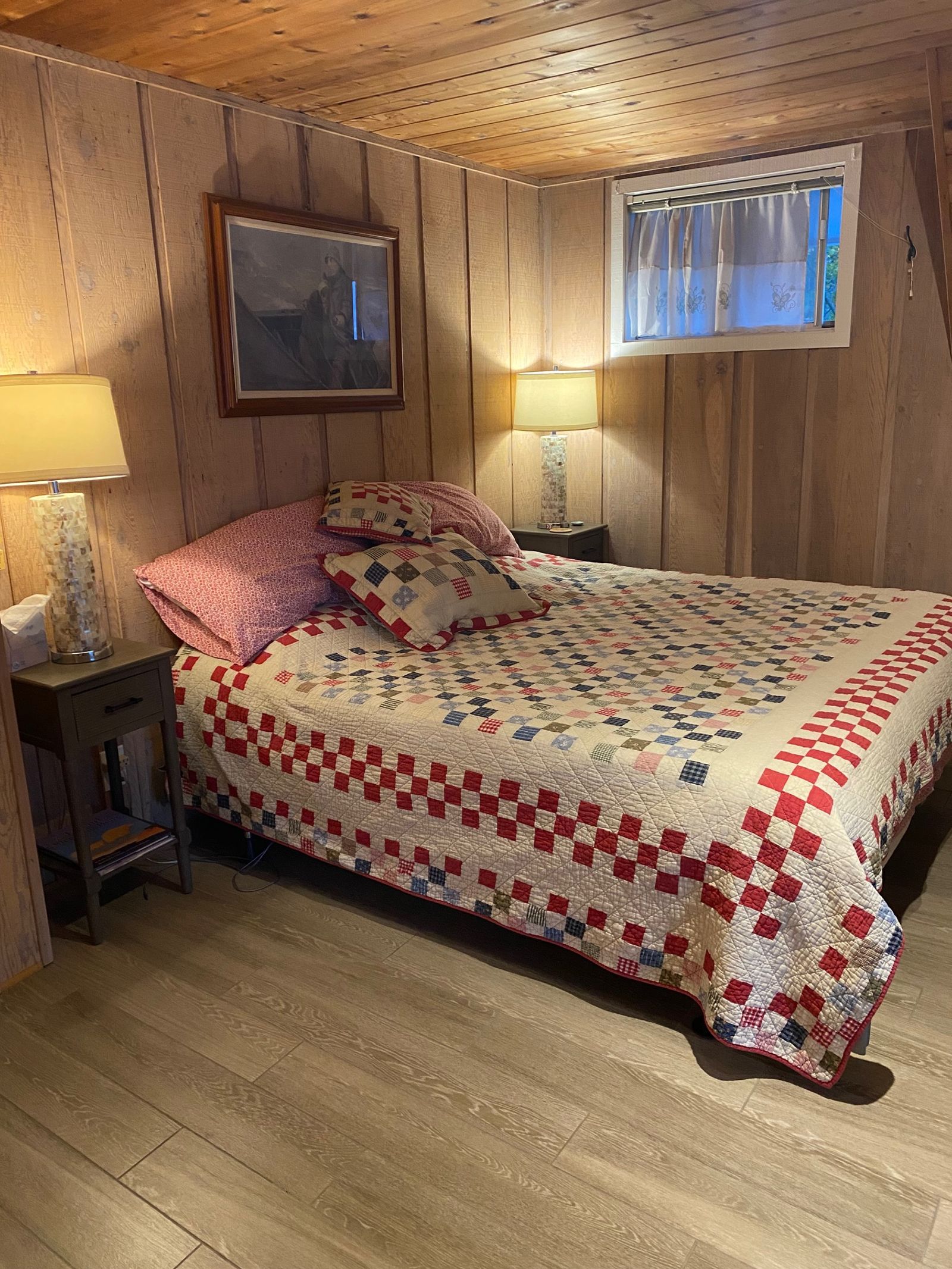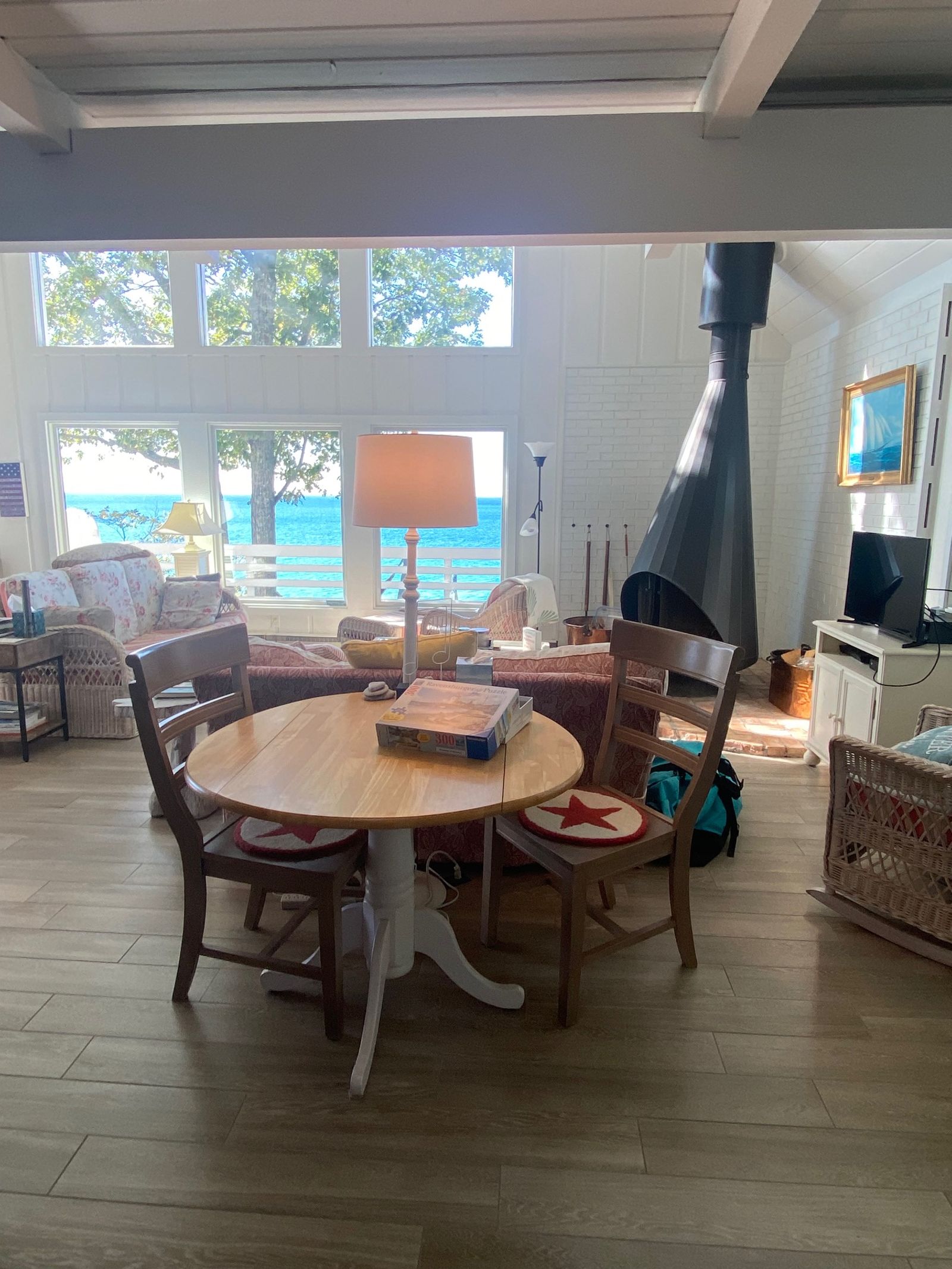 Inside, there are also great lake views from the living room, dining room, and one of the bedrooms. The home has 4 bedrooms and 2 bathrooms. There are 2 bedrooms and 1 bathroom on each floor, with the second floor bedrooms and bathroom being basically mirror images of the first floor bedrooms and bathroom. The cottage also features a full kitchen with a dishwasher, a wood fireplace in the living room (firewood not provided), high-speed Wi-Fi, satellite and streaming television, board games, puzzles, a front load washer and dryer, and air conditioning.