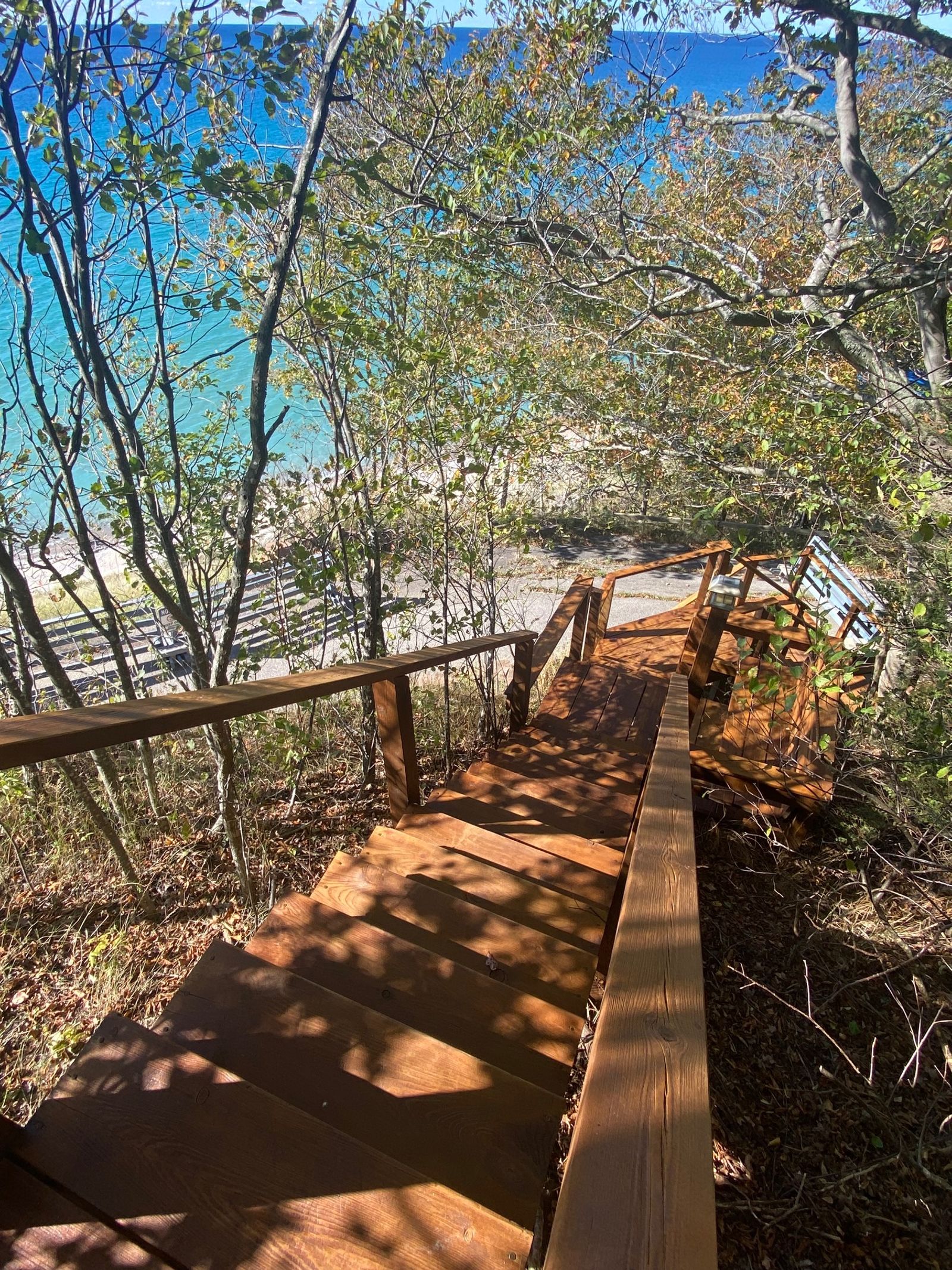 8) BLUFF: The home is on top of a very fragile sand bluff overlooking Lake Michigan. There are huge bags of sand at the base of the bluff to prevent future erosion. Guests are not permitted to climb the sand dune for both their safety and the safety of the bluff. (The private beach can be accessed via the nextdoor neighbor's stairs, which are shared with guests.) Similarly, the driveway portion that is directly between the house and the bluff is blocked off and cars are not permitted on this part of the driveway. This is again for both the safety of guests as well as the safety of the bluff since the top of the driveway is fragile and may give way.